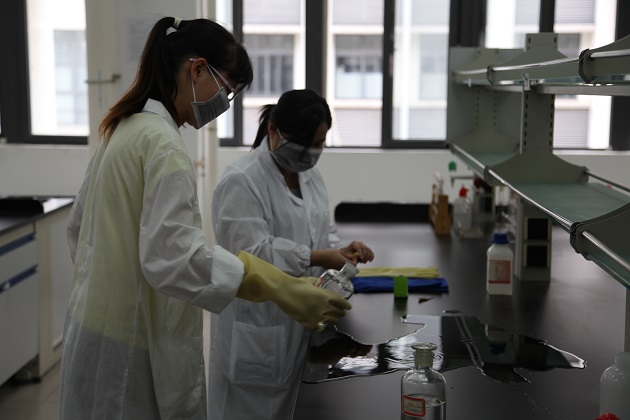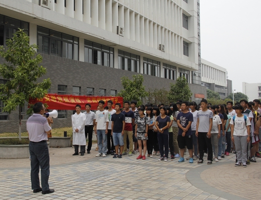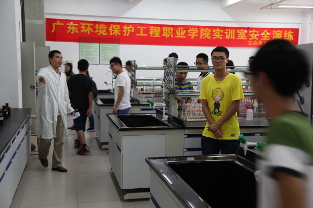 氨水泄漏应急演习在实训楼D栋化学实验室305、307、312、314进行,共有来自环境监测系、环境工程与土木工程系、环境科学系、循环经济与低碳经济系等33个班级的152名同学参与。演习程序包括:在314实训室模拟氨水泄露事故的发生,现场实验员发现事故后,由一名实验员带领受害学生去准备室冲洗眼睛,并安排本实训室内其他学生有序地疏散;另一实验员立即通知其他实训室实验员安排学生疏散,并马上报告安全小组;安全小组即刻将泄漏情况上报总指挥,并安排隔离小组与泄漏物处理小组对泄漏问题进行处理。演习中,各小组行动迅速,严格按照方案进行,15分钟内完成了化学实验室全体人员的疏散、清点工作及泄露问题的处理。