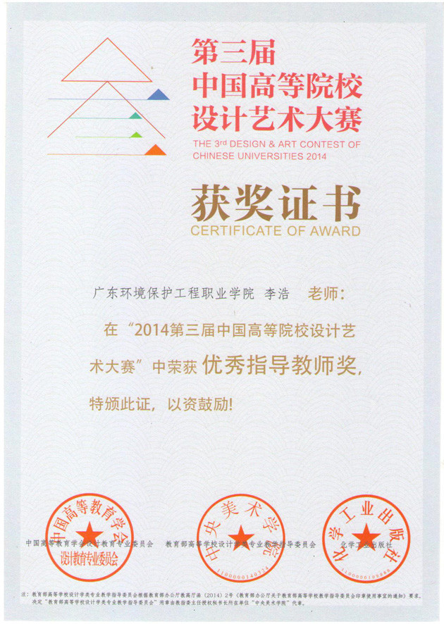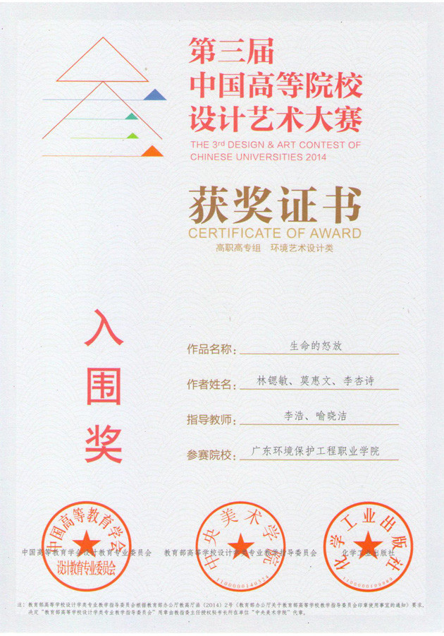 2014年12月由中国高等教育学会设计教育专业委员会、教育部高等学校设计学类专业教学指导委员会等机构主办的“第三届中国高等院校设计艺术大赛”已圆满落幕。我院以李浩、喻晓洁、朱琦聪三位老师指导的12届环境艺术专业课程作业参赛。在面对全国其它高等院校以毕业设计为参赛作品的强大竞争中依然显示一定优势,最终林锶敏、莫慧文、李杏诗小组作业《生命的怒放》和叶艳霞、杨晓青小组作业《方与圆》入围全国大赛并获奖。在本次比赛中我院团队师生不畏困难、团结进取的精神面貌给组委会留下深刻印象,最终我院获颁“优秀组织院校奖”,李浩老师获优秀指导教师奖。