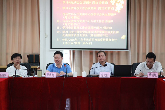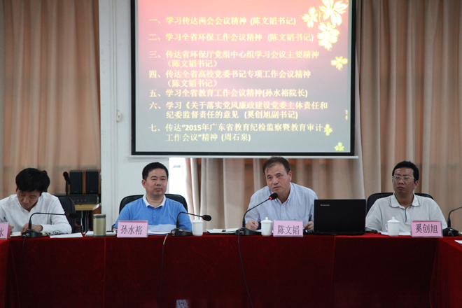 4月2日下午,我院在行政楼401会议室召开2015年第二次党委中心组理论学习会议。陈文韬书记传达学习了两会会议精神、全省环保工作会议精神、省环保厅党组中心组学习会议主要精神、全省高校党委书记专项工作会议精神;孙水裕院长传达了全省教育工作会议精神;副书记兼纪委书记奚创旭传达了《关于落实党风廉政建设党委主体责任和纪委监督责任的意见》;党办周石泉同志传达了“2015年广东省教育纪检监察暨教育审计工作会议”精神。会议由学院党委书记陈文韬主持,院长孙水裕、副书记兼纪委书记奚创旭、副院长刘晓冰,学院中层干部及各支部(总支)书记和副书记参加了会议。