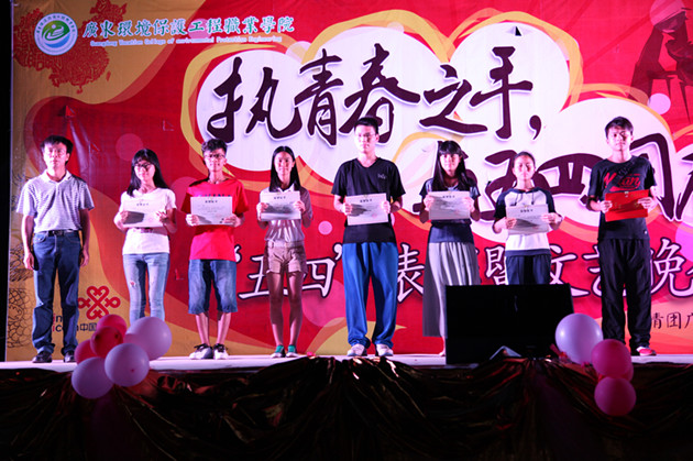 在表彰仪式结束后,五四文艺晚会隆重举行。晚会由两组主持人分别带领各个节目组成活力队和热血队,在舞台上以PK赛的形式呈献给大家。有舞蹈、格斗、魔术、唱歌等,节目活力无限、精彩纷呈,引起无数的尖叫及掌声。最后何丽娇老师的一首《映山红》将整台晚会推向了高潮,此次晚会获得一等奖的节目是生态系的小品《时光倒流》,二等奖的节目是院舞蹈队的舞蹈《七彩时光》、三等奖的节目是魔术协会的魔术表演《幻想时刻》。