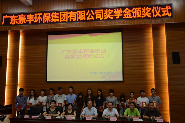 (附注:“豪丰奖学金”,即广东豪丰环保集团有限公司在我院设立的奖学金,每学年评选一次,主要评选环境监测系、环境工程与土木工程系、 机电工程系(机电设备维修与管理专业方向)大二的品学兼优的学生。“豪丰奖学金”名额为15名,其中一等奖5名,金额800元/人;二等奖10名,金额600元/人。豪丰集团联合学院召开表彰大会,对获奖同学颁发证书和奖金。)