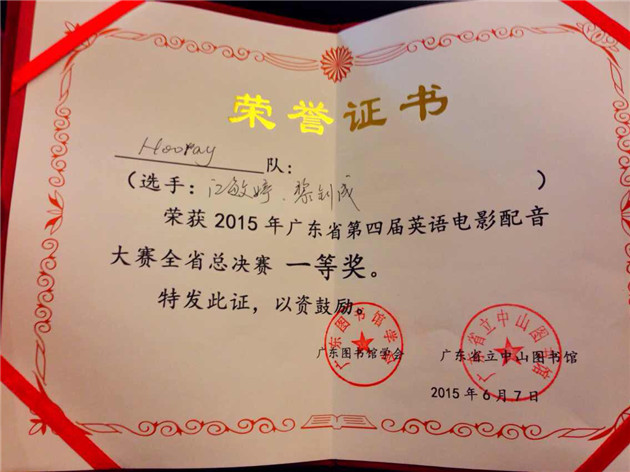 2015年6月7日下午,广东省第四届英语电影配音大赛总决赛在广东省立中山图书馆举行。经过紧张角逐,由我院生态环境系13级学生江敏婷、黎钊成组成的团队——Hooray以《长发公主》勇夺一等奖。