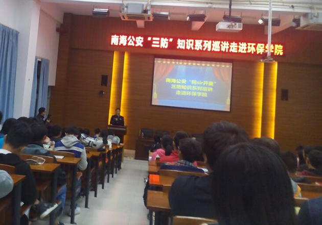 为进一步营造平安校园,预防安全事故的发生,12月4日下午,南海公安分局古嘉强、刘卫清警官以“‘三防’知识系列巡讲走进环保学院”为题,在教学楼116多功能厅举办了安全教育培训活动并发放安全宣传手册,200名师生参加活动。