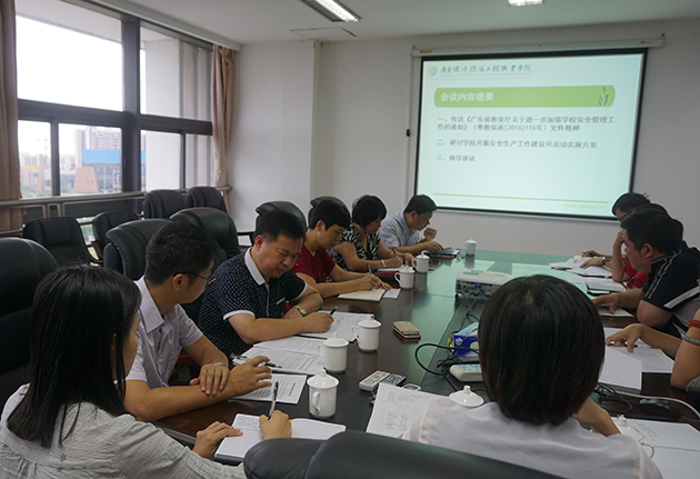 会议传达了省教育厅关于进一步加强学校安全管理工作的相关文件精神。职能部门负责人分别就国庆节期间学院实验室、食堂餐饮、水电气、学生宿舍、车队出行及顶岗实习生安全管理等各方面工作安排进行了汇报。会议还对学院开展安全生产建设月活动的实施方案进行研讨。