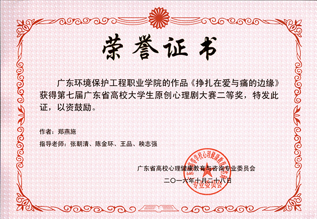 近日,由广东省高校心理健康教育与咨询专业委员会主办的2016年各项心理健康技能比赛结果公布,我院4项参赛作品获奖,分别是:在第七届广东省高校大学生原创心理剧比赛中,我院参赛作品《挣扎在爱与痛的边缘》获二等奖;在第二届广东省高校大学生“心理健康教育与咨询技能三大比赛结果”演讲比赛中,我院参赛作品《我不是别人家的孩子》《为梦想而奋斗》《敢说敢自我》获三等奖。