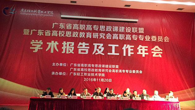11月26日,广东省高职高专院校思想政治理论课建设联盟暨广东省高校思想政治教育研究会高职高专专业委员会学术报告及工作年会在广东轻工职业技术学院举行。全省43所高职院校党委书记、党委副书记、马克思主义学院院长、思政部主任、思政课骨干教师等123人出席会议。党委副书记李杨红与思政部教师一行4人参加了会议。