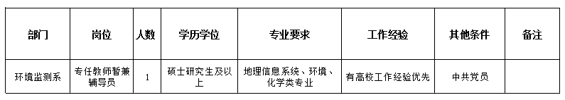 因工作需要,环境监测系面向社会招聘专任教师暂兼辅导员1名。
