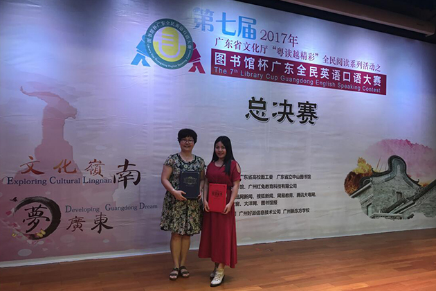 5月21日,第七届图书馆杯广东全民英语口语大赛总决赛在省立中山图书馆举行。大赛由广东图书馆学会、广东省高校图工委、广东省立中山图书馆主办。我院13级生态环境系江敏婷同学从全省2万名选手中脱颖而出,获得二等奖。谢雯老师获得“最佳指导教师”称号。 (文/图 基础教育部 于献波)